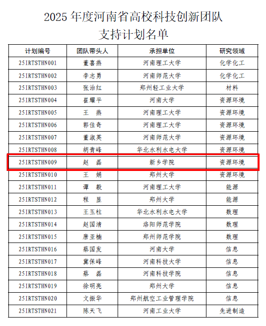 近日,河南省教育厅公布了2025年度河南省高校科技创新团队和创新人才支持计划名单(教科技〔2024〕354 号),由万博官网赵磊教授为带头人申报的“低碳建筑材料”获批河南省高校科技创新团队支持计划项目支持。