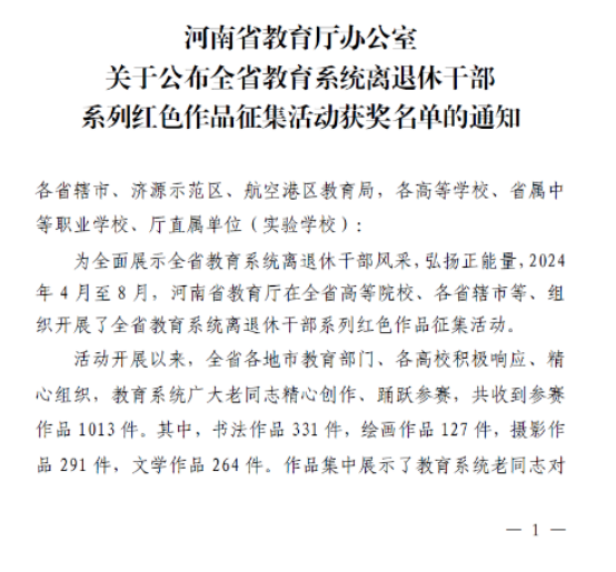 此次获奖,既是对万博max体育官网入口离退休干部文艺创作水平的肯定,也是对他们积极参与社会活动的鼓励。希望获奖的老同志珍惜荣誉,再接再厉,继续以诗书画影创作为载体,唱响主旋律,弘扬正能量,持续展示老有所学、老有所乐、老有所为的精神风貌,积极为建设现代化河南赋能助力,奋力谱写新时代绚丽篇章贡献智慧和力量。