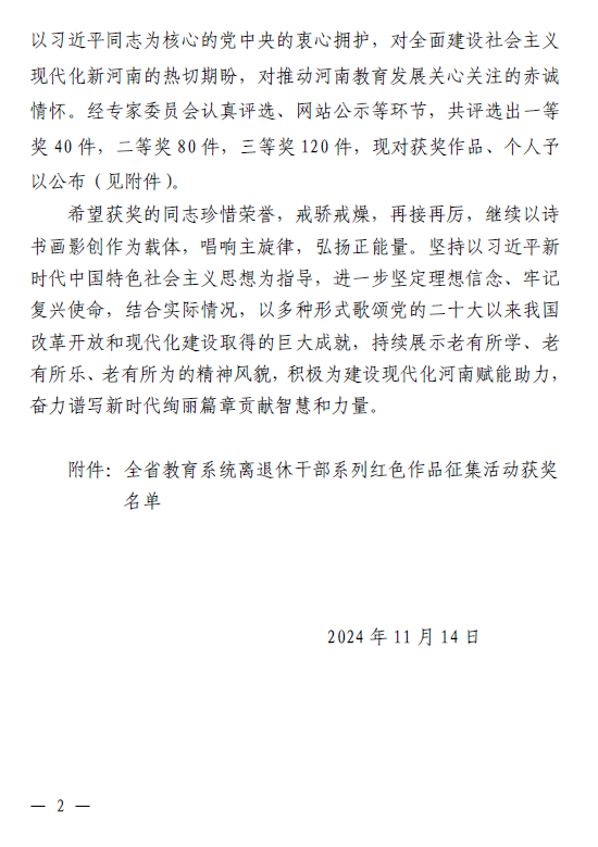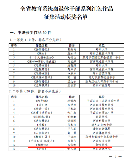 近日,河南省教育厅下发教办离退〔2024〕353号文件,表彰在全省教育系统离退休干部系列红色作品征集活动中获奖作品。此次作品集中展示了教育系统老同志对以习近平同志为核心的党中央的衷心拥护,对全面建设社会主义现代化新河南的热切期盼,对推动河南教育发展关心关注的赤诚情怀。万博官网退休干部张保德《魏源诗》荣获书法获奖作品二等奖;祝莹雪《对联》荣获书法获奖作品三等奖;刘新华《江山锦绣》荣获绘画获奖作品二等奖。