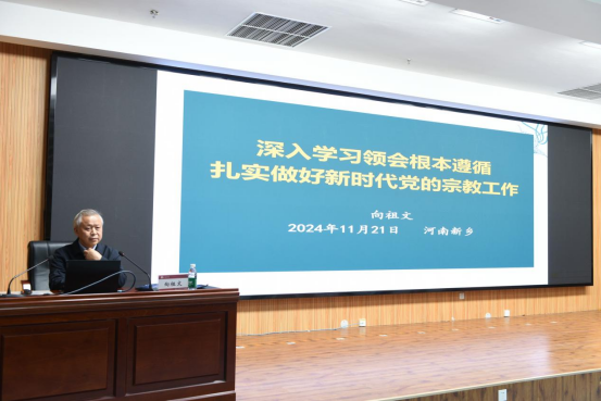 湖北省民族宗教事务委员会原办公室主任、一级调研员向祖文作《深入领会根本遵循、扎实做好新时代党的宗教工作》的专题辅导报告。从“新时代党的宗教工作的根本遵循”“新时代党的宗教工作重点任务”“贯彻宗教工作理论方针政策中的几个重要关系”“落实构建宗教事务治理格局的工作职责”四个方面,系统讲解了新时代党的宗教工作理论方针政策。