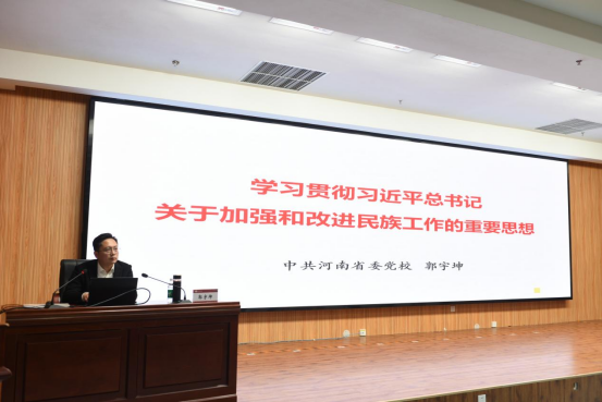 河南省委党校郭宇坤博士作《学习贯彻习近平总书记关于加强和改进民族工作重要思想》专题报告。从习近平总书记关于加强和改进民族工作重要思想形成背景、重要内容以及如何进一步贯彻落实三个方面系统讲解了“铸牢中华民族共同体意识形成发展过程”“为什么要铸牢中华民族共同体意识”“为什么能铸牢中华民族共同体意识”。