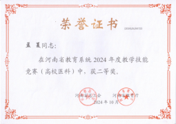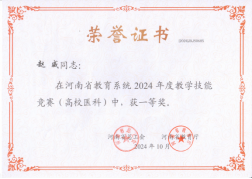 近日,由河南省总工会、河南省教育厅举办的河南省教育系统教学技能竞赛结果揭晓,获奖教师凭借扎实的专业能力、创新的教学设计赢得专家评委的高度认可,赵威老师获得高校医科组一等奖、孟夏老师获得高校医科组二等奖。