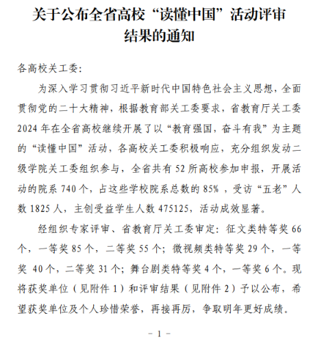 近日,河南省教育厅关工委下发了《关于公布全省高校“读懂中国”活动评审结果的通知》(豫教关〔2024〕28号),公布了2024年全省高校“读懂中国”活动评审结果。万博官网在此次活动中表现突出,荣获全省高校“读懂中国”活动单位奖,并在征文和微视频两个类别中多项作品获奖。