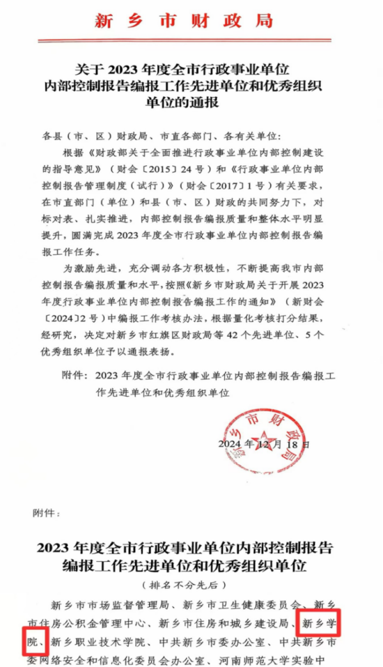 近日,新乡市财政局下发了《关于2023年度全市行政事业单位内部控制报告编报工作先进单位和优秀组织单位的通报》,万博官网被评为2023年度内控报告编制工作先进单位。这一荣誉不仅是对万博官网在报告编制过程中严谨态度与专业知识的高度认可,更是对单位整体内部控制建设与执行成效的充分肯定。