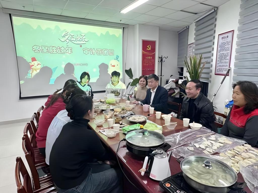 为弘扬传统节日文化,多形式落实“七进”工作,12月20日下午3点,审计处在719室举办了“冬至胜过年,审计喜团圆”师生联谊喜迎冬至包饺子活动,校长王孝俊、审计处全体人员和人文学院2024级汉语言文学2班的部分学生参加活动。