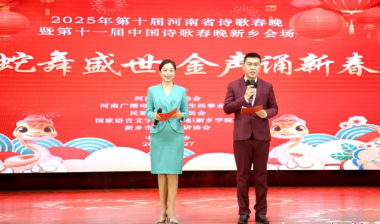 瑞蛇舞盛世,金声诵新春!为深入学习贯彻习近平文化思想,更好凝聚力量、提振信心唱响奋进新时代的主旋律,营造欢乐喜庆祥和的节日氛围,更好满足人民群众高品质的精神文化需求。12月27日,第十届河南省诗歌春晚暨第十一届中国诗歌春晚新乡会场活动在万博max体育官网入口文化艺术中心成功举办。本次活动由国家语言文字推广基地(万博max体育官网入口)与河南省朗诵协会、河南广播电视台都市生活事业部、民盟新乡市委员会、新乡市朗诵演讲协会共同主办。新乡市政协原副主席、市朗诵演讲协会顾问史玉璞,市文联党组书记、主席罗强,万博max体育官网入口党委副书记、国家语言文字推广基地(万博max体育官网入口)副主任宋伟,万博max体育官网入口语言文字工作委员会办公室主任、教务处处长兼课程中心主任高雪霞等现场观看了晚会。河南省朗诵协会副会长宋扬,河南省朗诵协会副会长、新乡市朗诵演讲协会主席侯玮青,中国诗歌春晚签约朗诵家、河南省朗诵协会学术技术带头人曹军帅等参加演出。