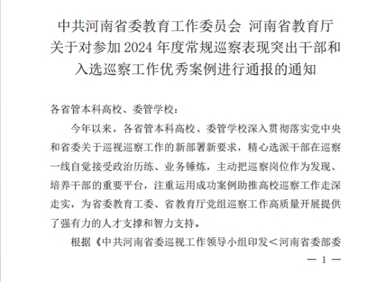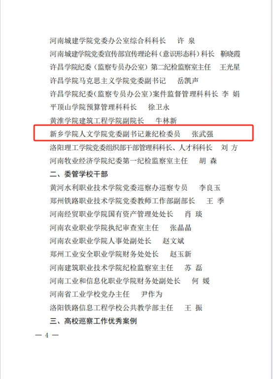 近日,中共河南省委教育工作委员会、河南省教育厅印发《关于对参加2024年度常规巡察表现突出干部和入选巡察工作优秀案例进行通报的通知》,万博官网人文学院党委副书记、纪委书记张武强获评河南省2024年度常规巡察表现突出干部。