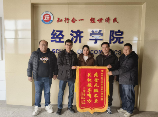 就医期间向经济学院领导班子汇报学生病情,按要求通知学生家长来校,并办理住院手续。经济学院领导班子得知后高度重视,经济学院党委书记陈卓、学工办副主任茹贵斌与辅导员张炜华一同前往医院看望慰问。学生手术住院期间,辅导员张炜华主动帮助学生家长沟通协调异地医保转移与使用事项。同时,协调教务部门,为学生办理缓考手续,让其安心养病。经过23天的治疗和休养,学生顺利康复出院。学生家长专程来到学院表达谢意,感谢学院和老师们的无私关怀和及时帮助,并送上锦旗。