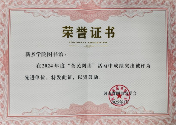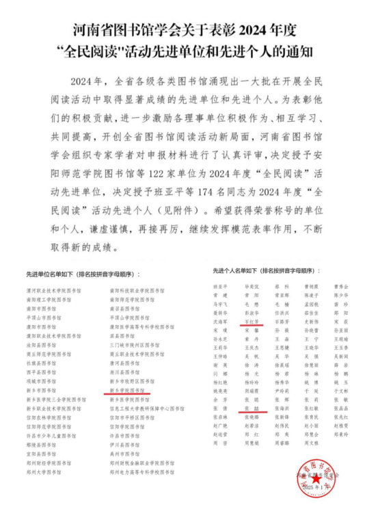 万博官网图书馆荣获2024年度“全民阅读”活动先进单位称号,石红芳、张喆两位老师荣获“全民阅读”先进个人称号。