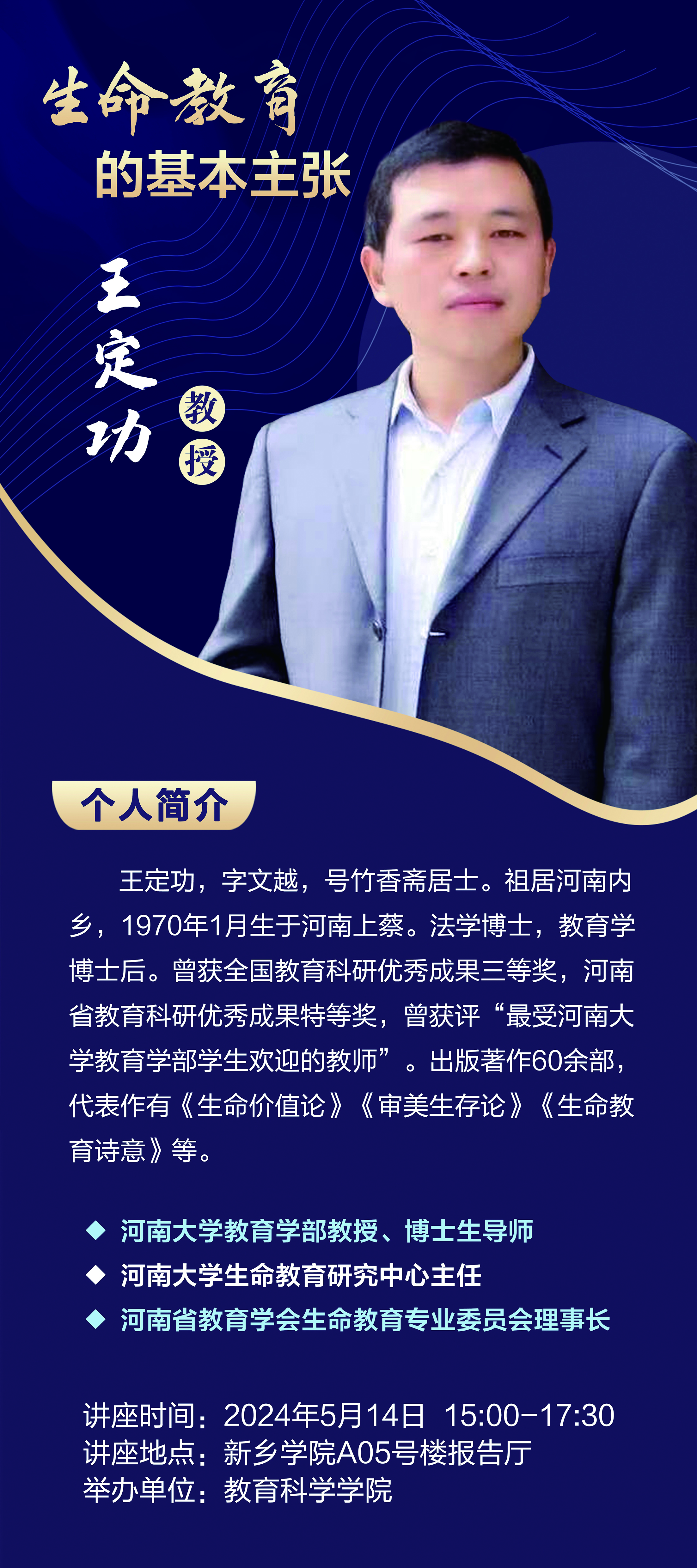 王定功,字文越,号竹香斋居士。祖居河南内乡,1970年1月生于河南上蔡。法学博士,教育学博士后。现任河南大学教育学部教授、博士生导师,河南大学生命教育研究中心主任,河南省教育学会生命教育专业委员会理事长。曾获全国教育科研优秀成果三等奖,河南省教育科研优秀成果特等奖,曾获评“最受河南大学教育学部学生欢迎的教师”。出版著作60余部,代表作有《生命价值论》《审美生存论》《生命教育诗意》等。