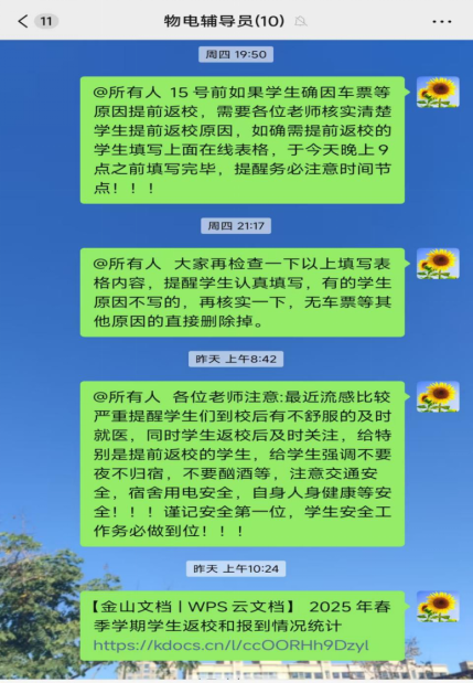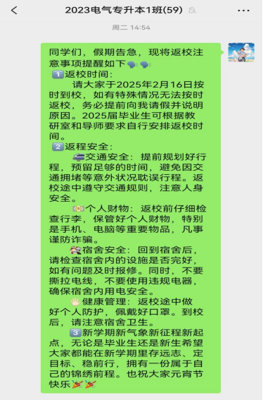 开学前,物理与电子工程学院主要开展了以下三项工作。第一,多渠道发布返校提醒,确保信息全覆盖。为帮助学生提前了解返校安排及注意事项,学院通过多种渠道发布返校提醒。辅导员在班级群中详细说明了返校时间及注意事项,包括交通安全、个人财物安全、宿舍安全及健康管理等要点。同时,学院官方微信公众号发布了开学攻略推文,以图文并茂的形式为学生提供清晰指引,确保每位同学都能及时获取相关信息。通过多渠道发布返校提醒,学院有效实现了返校提醒的全覆盖,确保了信息的及时传达。同学们也表示清晰的返校安排和细致的注意事项帮助他们更好地规划行程,提前做好返校准备。学院也将持续关注学生需求,优化信息发布机制,为学生提供更加便捷、高效的服务。