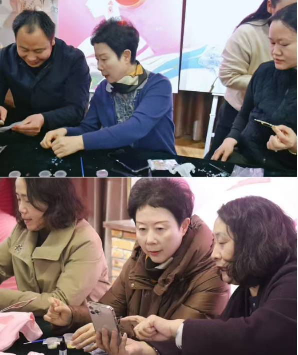 活动前期,师生们围绕女性心灵寄语主题进行绘画创作,用画笔展现当代女性细腻温暖的内心世界,并在画作上写下饱含深情的寄语。活动期间,师生专注于非遗螺钿制作,认真交流螺钿镶嵌技巧,精心创作了一件件精美的螺钿工艺品,充分彰显出非遗文化的独特魅力。