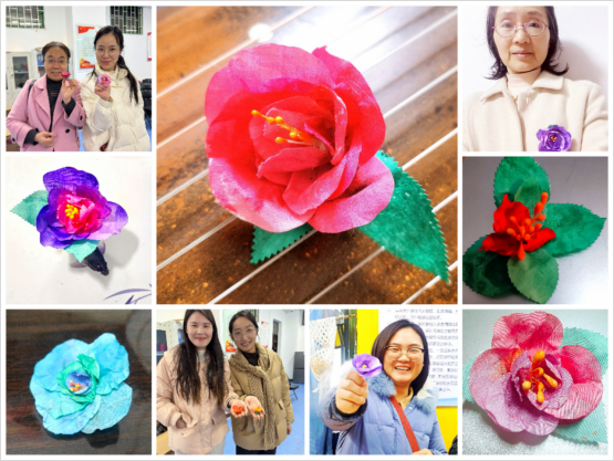 本次活动由专业艺术技能教研室教师严艺、应芳等全程指导。首先由严艺老师介绍烫花胸针的制作方法,包括花瓣染色、烫花器定型、花瓣及叶子串连、捆绑花朵、粘合底托等五个步骤,做好的成品每一片花瓣的卷曲形态都是独一无二的,每朵花都蕴藏着制作者的独特匠心和温度。老师们热情洋溢,个个亲自动手操作,大家边听边学,耐心地按照老师的指导,结合自己的创意逐步进行制作。不一会儿,一朵朵精巧别致、形状各异的烫花胸针就盛开在老师们的手中。