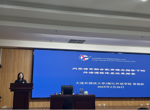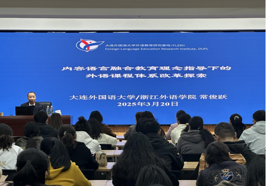 3月20日下午,外国语学院邀请大连外国语大学博士生导师常俊跃教授在图书馆一楼东报告厅作了题为“内容语言融合教育理念指导下的外语课程体系改革探索”的学术讲座。学术讲座由副校长韩辉教授主持,外国语学院班子成员和全体教师聆听了讲座。