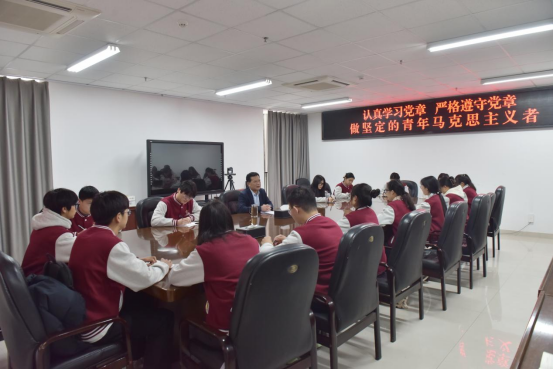 党章是一个永不僵化的思想宝库,是百年大党践行初心使命、创造历史辉煌的不懈奋斗史,是持续深化的制度体系和动态更新的文本系统,是我们党谋篇布局伟大事业的精品大作。孙功奇对同学们提出四点要求,一要认真学习、全面掌握,做到心中有党;二要坚定信念、严于律己,做到心中有责;三要言有所戒、行有所止,做到心中有矩;四要敢于亮剑,善于斗争,做到心中有戒。希望同学们不忘初心、牢记使命,用奋斗书写青春绚丽的篇章,用一生的实践证明自己是一名坚定的马克思主义者。
