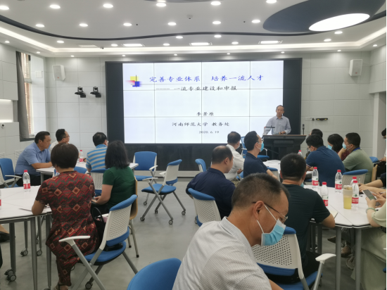 6月19日上午9:30,万博官网在A05智慧教室召开河南省“一流专业”建设和申报专题报告会,特邀河南省高校科学技术带头人、生物学学科领域专家、中国植物学会结构学专业委员会委员、河南省植物学会副理事长、河南师范大学教务处副处长李景原教授来校作培训报告。报告会由教务处处长夏锦红主持。各学院院长、教学副院长及部分专业教师30余人参加。