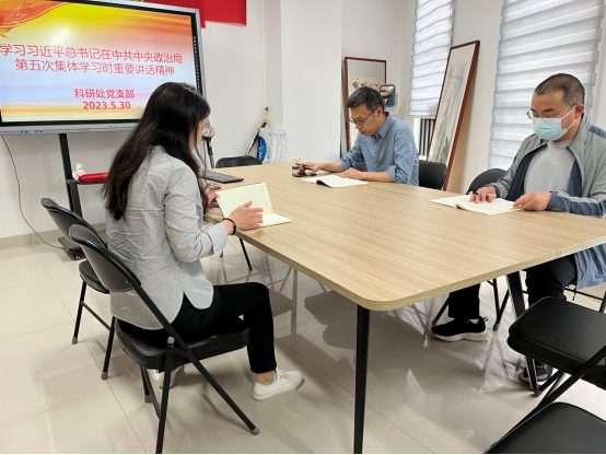 为及时跟进学习习近平总书记最新重要讲话精神,深入开展学习贯彻习近平新时代中国特色社会主义思想主题教育,根据机关党委《关于集中学习习近平总书记在中共中央政治局第五次集体学习时重要讲话精神的通知》,科研处党支部于5月30日下午在图书馆819室集中学习了习近平总书记在中共中央政治局第五次集体学习时重要讲话精神。学习活动由科研处党支部书记赵磊主持。